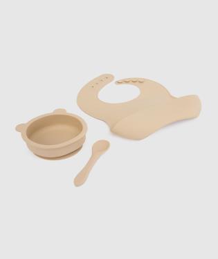 | Features and benefits •For babys first adventures with food, in soft and tactile silicone thats gentle on their gums and soft to the touch • With an adjustable bib and suction-bottomed bowl to minimise those oh-so-inevitable spills • Crafted from high-quality food-grade soft silicone, ensuring safe mealtimes The bib features four adjustable sizes so you can get just the right fit Suction bowl provides stability during mealtimes Dishwasher and steriliser safe for speedy cleans BPA free 3-piece set includes bib, bowl and spoon Fabric Composition : 100% Silicone;Spoon 100% Silicone;Bowl 100% Silicone Instructions : Do not bleach What's in the Box : bib, bowl, spoon