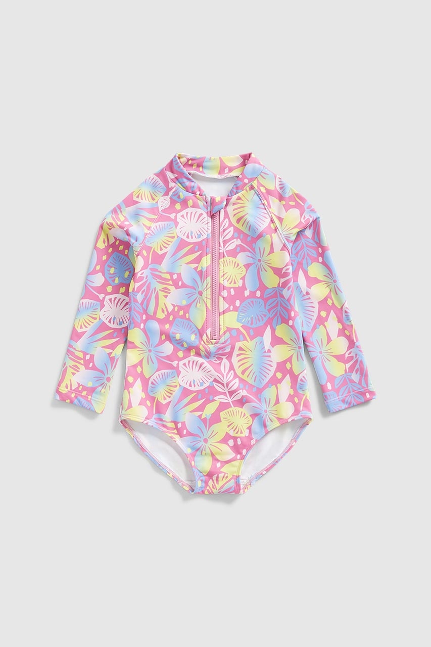 | At a Glance With a fiesta-worthy tropical print, this swimsuit is ready to catch the waves. Made with UPF50+ fabric with a high neckline and long sleeves, it's designed to protect from the sun (and to keep out the chill when the weather is not so tropical). Perfect for swimming and water sports with a handy zip which makes quick costume changes easy.