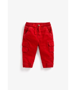 Features and benefits •relaxed fit cargo-style •enzyme wash which flattens the fibres to keep them soft - wash after wash •elasticated waistband with tie-cord •mock-fly with single popper fastening •lots of pockets •cord is fixed at the back to prevent little hands pulling it through Fabric Composition : 98% cotton 2%elastane Instructions : machine washable Safety Warning : keep garment away from fire Colour : red