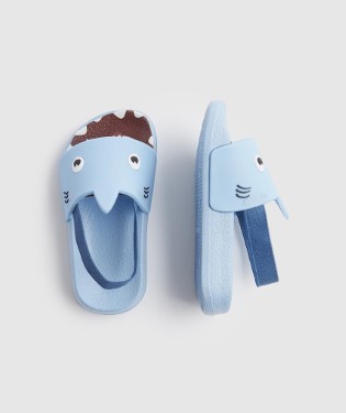 | At a Glance These sharks love playing at the pool or the beach! Super lightweight, these slider sandals are designed with a moulded footbed providing support and stability with every step. The novelty over-foot strap is fabric backed so it won't irritate skin, and the elasticated heel strap keeps them securely on busy feet.