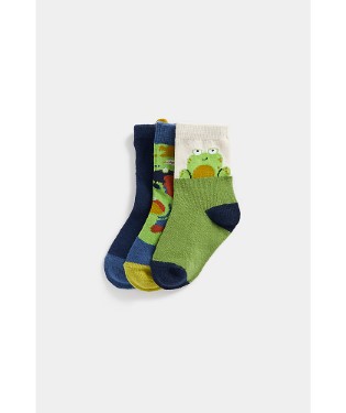 Features and benefits •3 pairs of short socks •Ribbed tops •Contrasting coloured heel and toe •1 x frog graphic 1 x novelty crocodile with 3D detail 1 x camo crocodile graphic Fabric Composition : Nylon, Cotton,Elastane Instructions : Machine Washable Safety Warning : Keep Away From Fire Colour : Multi