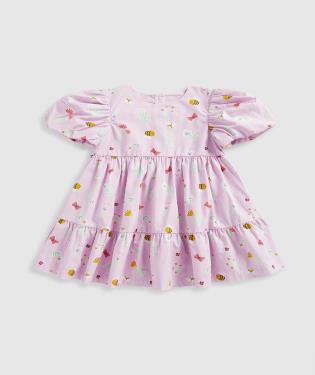 | At a Glance With buzzy bees and beautiful butterflies among garden flowers, this cotton dress is made for sunny days. Designed with a focus on comfort, it features short puff sleeves and a tiered twirly skirt.Responsibly sourced cotton is grown with all-natural growing methods, using less water to produce, and using no harmful chemicals. Safer for their skin and helping protect their world.