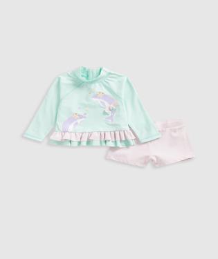 | Features and benefits •Not only is this short and swim vest set super cute, it's made from UPF50+ fabric to help protect delicate skin from the sun so they can play safely for longer • With diving dolphins and fluttery frills, it's ready to swim, surf, or just play in the sunshine • 2-piece sunsafe set UPF50+ fabric which provides UVA and UVB sun protection (98% effective at blocking UVA rays)Lightweight and quick-dryingShorts with wide, flat, elasticated waistbandLong, raglan-sleeved top with double frill hemZip fastening with zip guard to prevent skin pinchingPrinted dolphins with fabric frills Fabric Composition : 82% Recycled Polyester 18% Elastane Body 100% Polyester Mesh Instructions : Machine washable