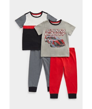 | At a Glance Race off to bed and relax comfortably on those pit-stop days in these fun pyjamas. Each pair is made from soft-on-skin cotton jersey with long cosy bottoms and short-sleeved tops.