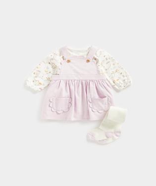 Features and benefits •3-piece outfit set •Pinny dress with scalloped detail •Lined for comfort •Adjustable button fastened straps •Elasticated back waist •Patch pockets •Printed bodysuit with envelope neck •Interlock knit which is soft, stretches easily and keeps its shape wash after wash •Long sleeves with elasticated cuffs •Popper fastening for easy nappy changes •Softly bound hems for comfort •Cosy tights with wide, stretchy waistband Fabric Composition : Bodysuit : 100% Cotton,Dress Shell : 100% Cotton,Dress Lining : 100% Cotton,Tights : 75% Cotton , 23% Nylon , 2% Elastane Instructions : Machine washable at 40 degrees