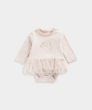 In the softest cotton which feels gentle against the most delicate skin, this pink bodysuit is decorated with a soft print and delicate embroidery. A layered tutu-style skirt makes it perfect for those first cuddly dances with baby.