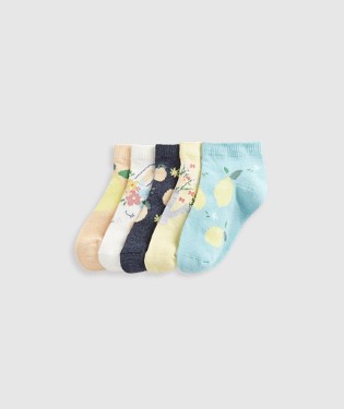 Features and benefits •5 pairs of short trainer socks •Ribbed sock tops •With a little stretch for comfort Fabric Composition : 76% Cotton,22% Nylon,2% Elastane Instructions : Machine Washable
